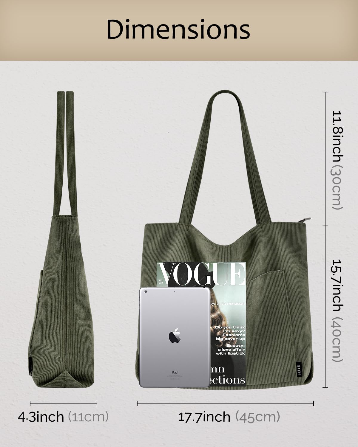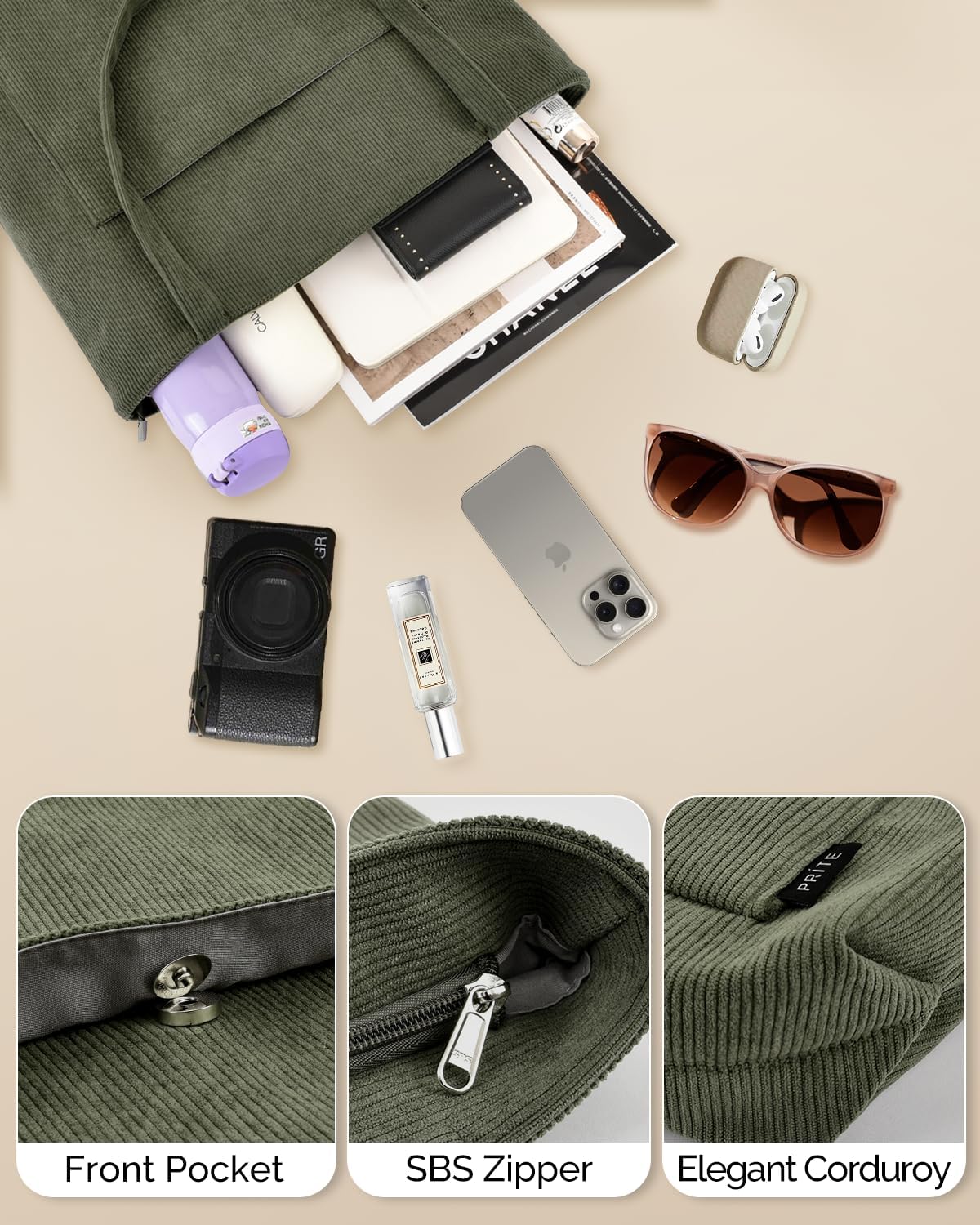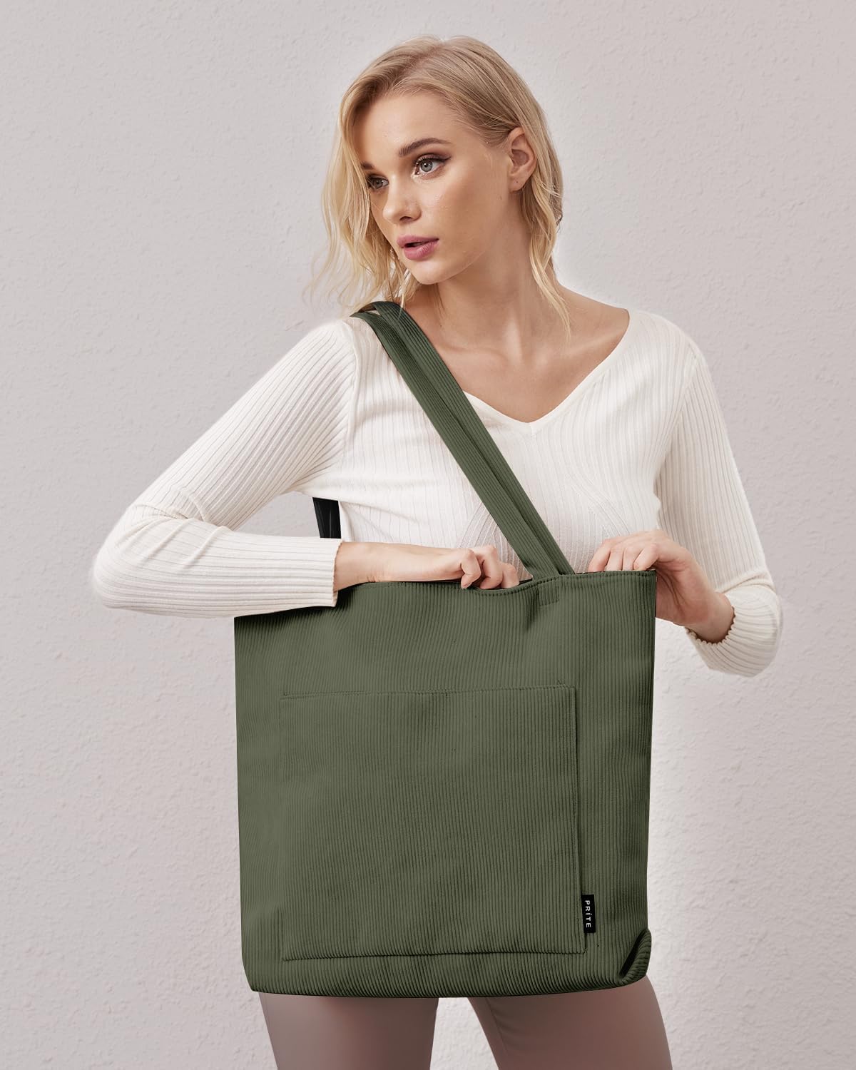 Prite is known for their attention to detail and commitment to quality. This corduroy tote exemplifies their dedication to craftsmanship with reinforced stitching at stress points and carefully finished edges. The corduroy material offers a distinctive texture that’s both visually appealing and practical, as it resists showing wear and maintains its shape over time. The interior lining is designed for durability, making this bag a long-lasting addition to your accessory collection.