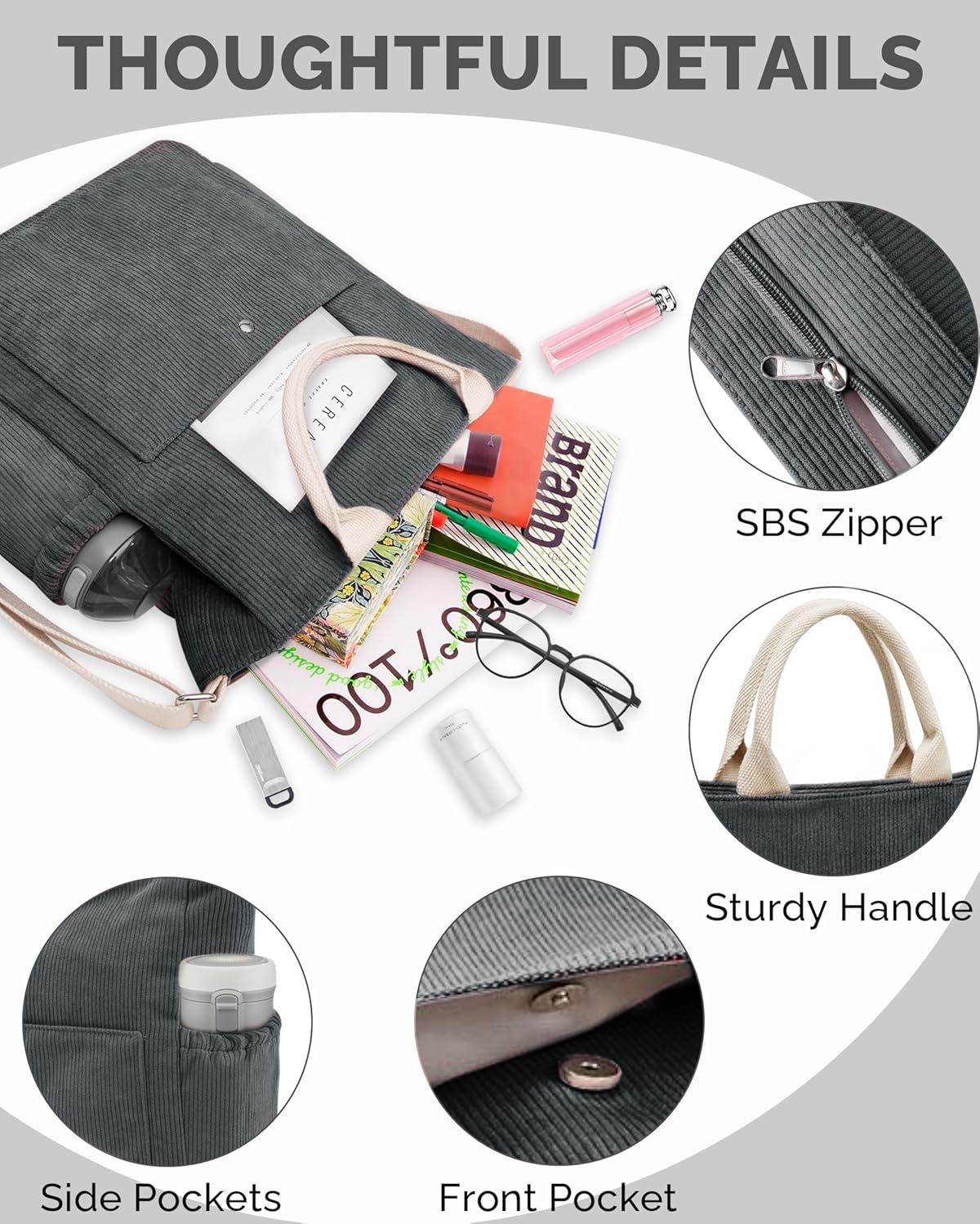 Never compromise between style and practicality again. The Prite Corduroy Tote features a generously sized main compartment that easily accommodates your daily essentials, from laptops and textbooks to shopping purchases. Multiple interior and exterior pockets keep smaller items like your phone, keys, and wallet easily accessible, eliminating the frustration of digging through your bag to find what you need. The thoughtful organizational elements make this tote perfect for busy professionals, students, and anyone who values both aesthetics and efficiency.