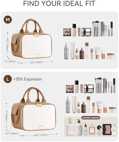 Choose the perfect size for your lifestyle with two versatile options. The Medium size (9.4″x6″x6.3″) provides ample space for your daily essentials, making it ideal for regular use or weekend getaways. For those who carry a more extensive collection or professional makeup artists, the Large size (10.6″x6.3″x7″) offers generous capacity to accommodate a full professional kit. Both sizes feature three separate compartments and multiple pockets, ensuring every item has its designated place for quick and easy access.
