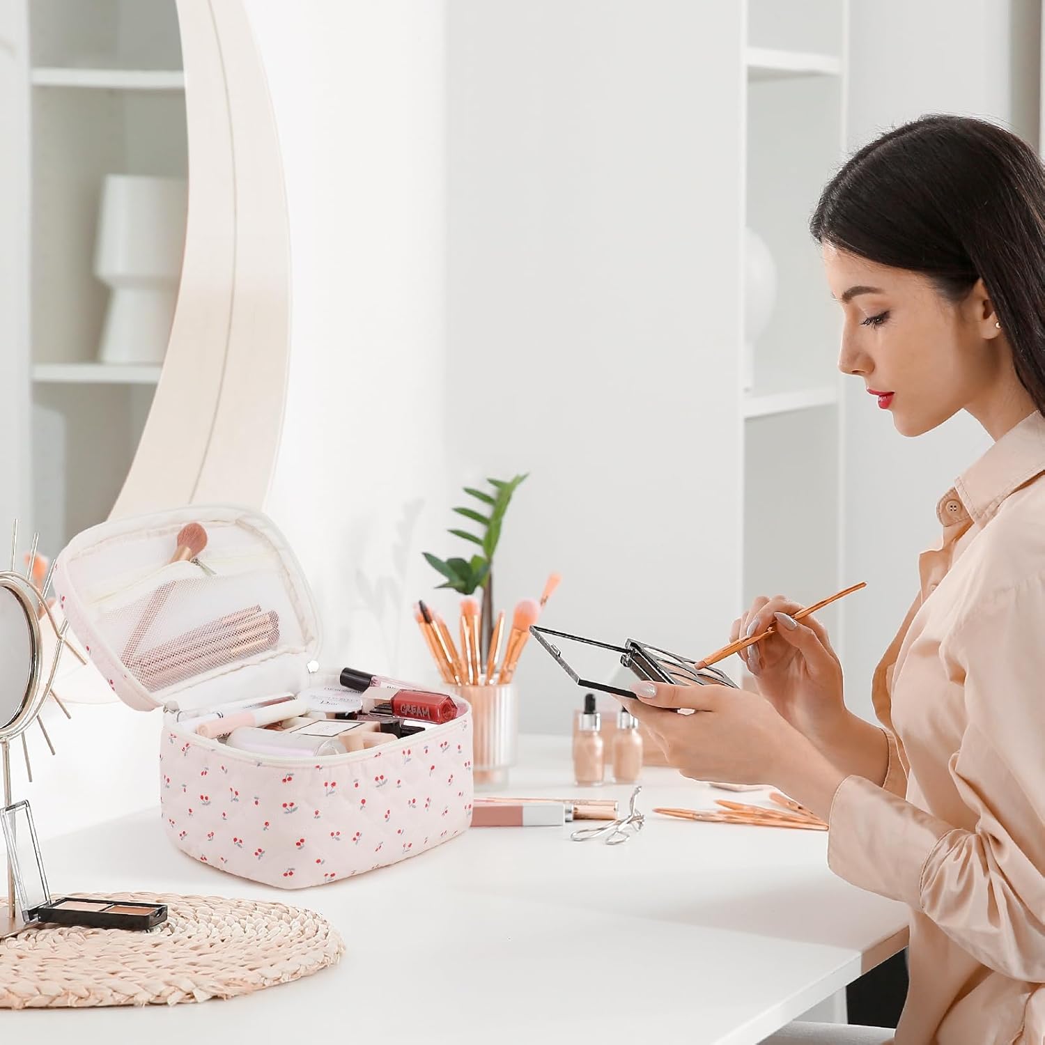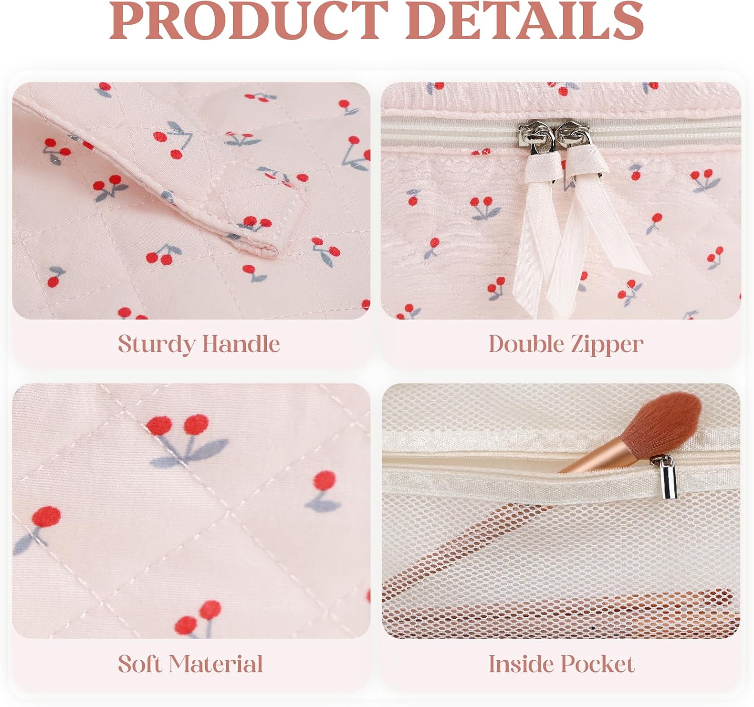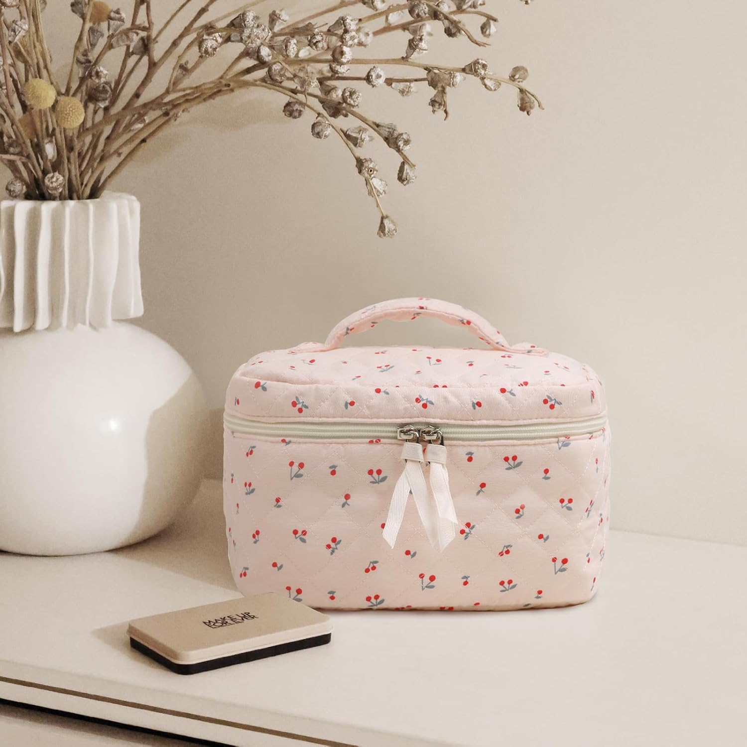 While designed primarily as a cosmetic organizer, the Prite bag’s versatility extends far beyond beauty storage. Use it as a toiletry bag when traveling, a stationery organizer for school or office supplies, or even as a small handbag for essentials. Its lightweight design and durable construction make it suitable for various storage needs, while the stylish cherry pattern ensures you’ll be proud to display it wherever you go.