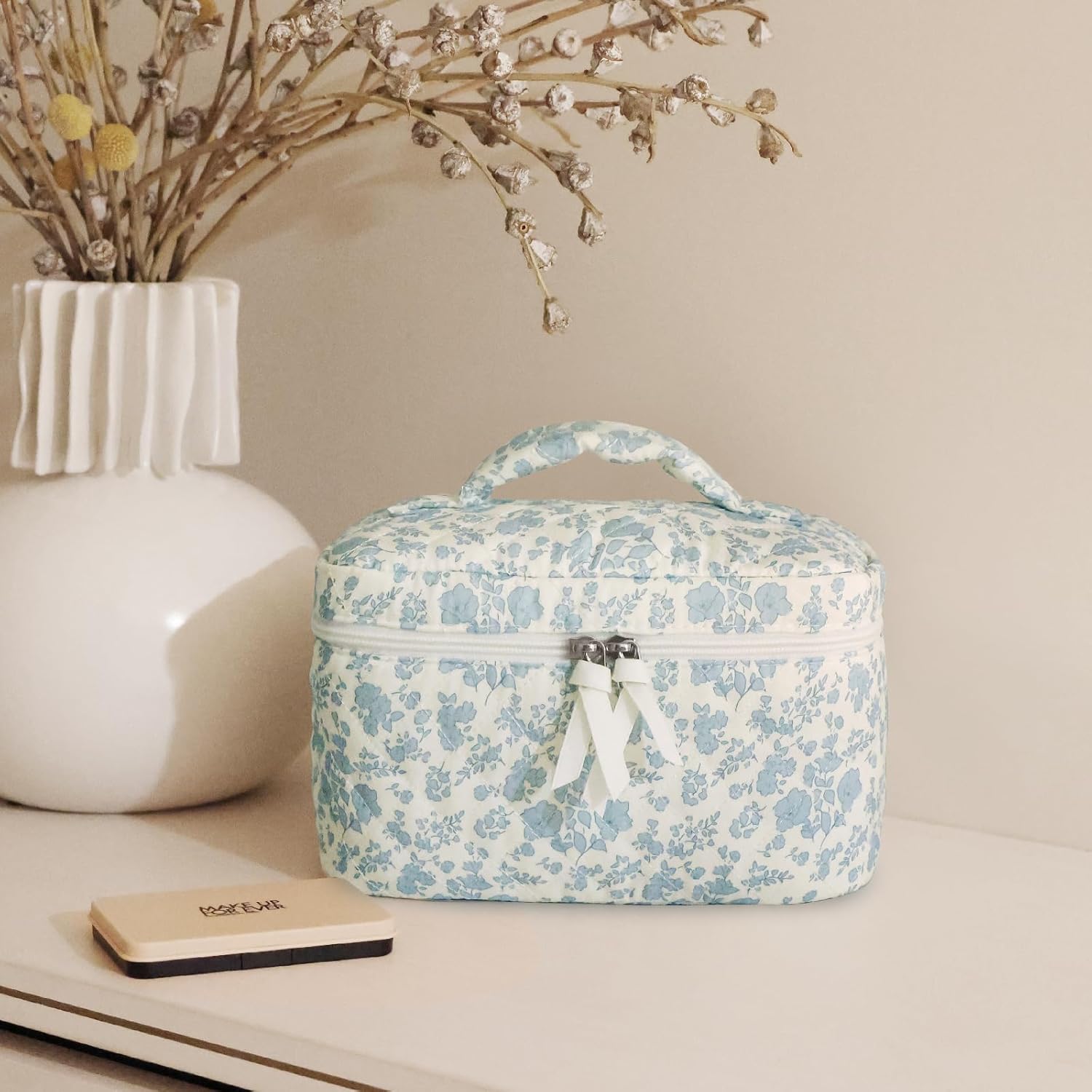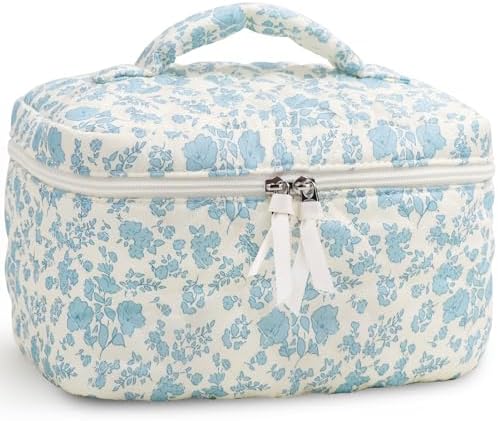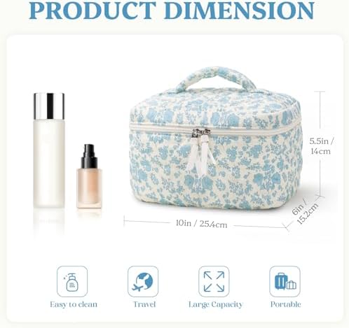 The Prite Large Makeup Bag combines style and functionality in a beautiful blue flower design. This spacious cosmetic organizer offers the perfect solution for keeping your beauty essentials organized at home or while traveling. With its high-quality cotton construction and thoughtful design elements, this bag stands out as both a practical necessity and a fashion statement.