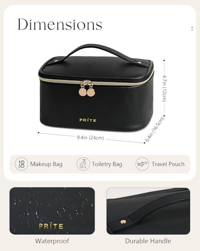 The Prite Makeup Bag combines style and functionality in a spacious design that meets all your cosmetic organization needs. Measuring 9.4 x 6.4 x 4.7 inches, this large capacity organizer is crafted from high-quality vegan leather that’s 100% waterproof, soft to the touch, and environmentally friendly. The black finish offers a timeless look that complements any travel ensemble or bathroom decor.