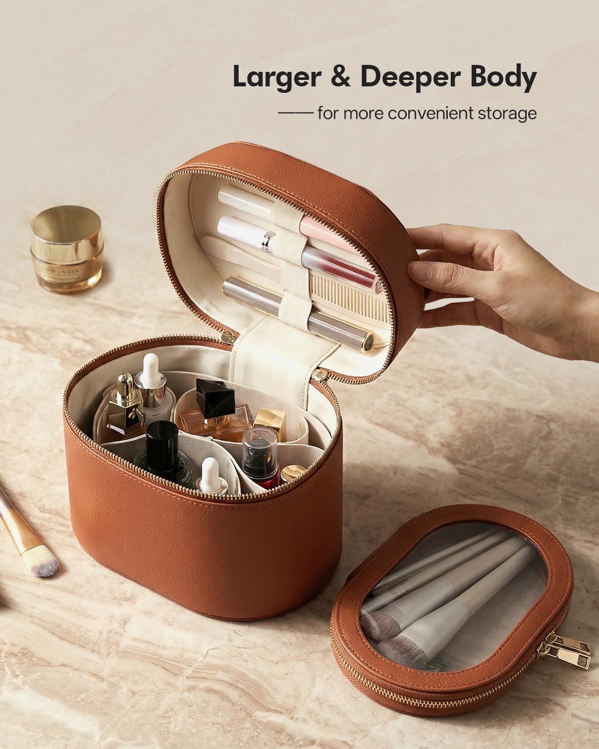 What sets the Prite Makeup Bag apart is its innovative organization system with removable dividers that allow you to customize the interior layout based on your unique collection. Arrange the compartments to accommodate bottles of different sizes, palettes, compacts, or create dedicated spaces for specific product categories. The elastic bands integrated into the lid securely hold makeup brushes, combs, and hair accessories, keeping everything in its place and easily accessible when you need it.